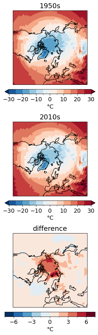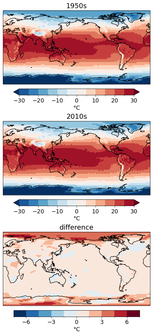 cbar_kwargs = dict(orientation='horizontal', shrink=0.7, pad=0.05, label='\u00B0C')map the average temperature and the difference between the 2 decades
