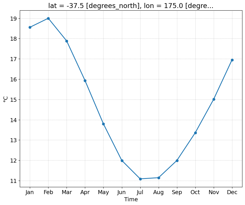 Auckland.groupby(Auckland.time.dt.month).mean('time')['air'].plot(ax=ax, marker='o')