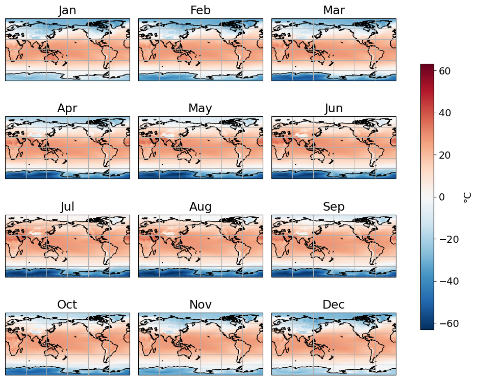 cbar_kwargs = {'shrink':0.7, 'label':'\u00B0C'}fg = climatology['air'].plot(figsize=(10,8), col='month', col_wrap=3, transform=ccrs.PlateCarree(), \