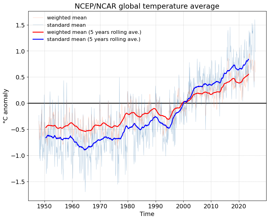 all_means.to_csv('./NCEP_global_means.csv')data = pd.read_csv('./NCEP_global_means.csv', index_col=0, parse_dates=True)data.head()| weighted mean | standard mean | weighted mean (5 years rolling ave.) | standard mean (5 years rolling ave.) | |