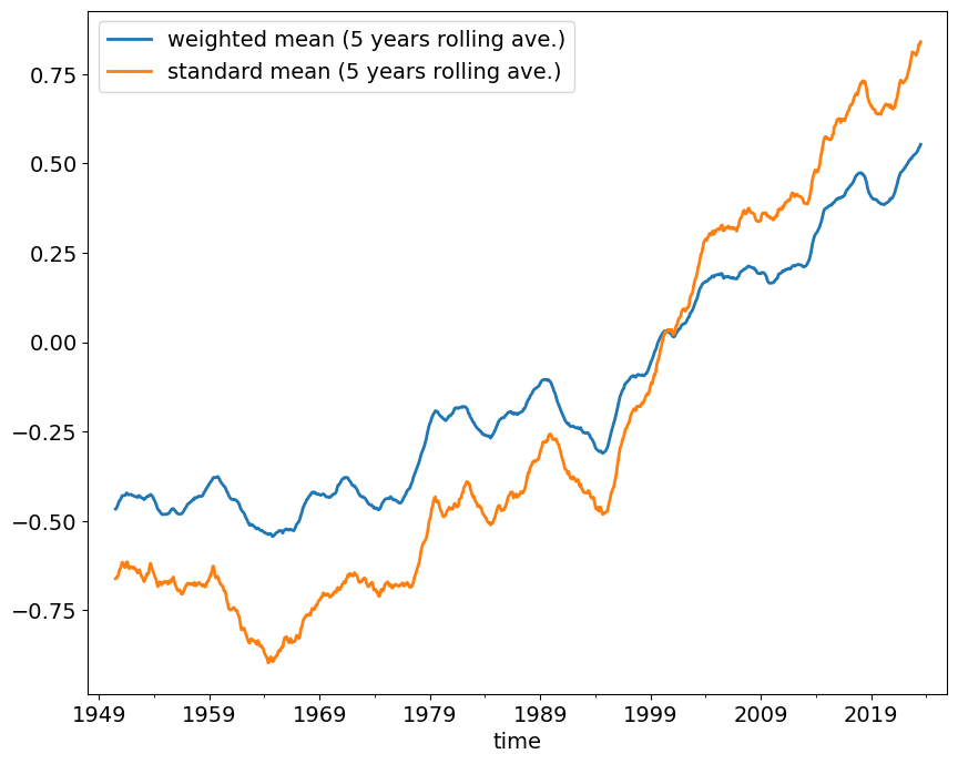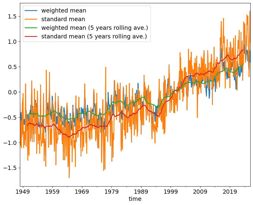 standard_mean = ncep_temp_anomalies['air'].mean(['lat','lon'])standard_mean_smooth = standard_mean.rolling(time=12*5, center=True).mean().dropna("time")Weighted mean