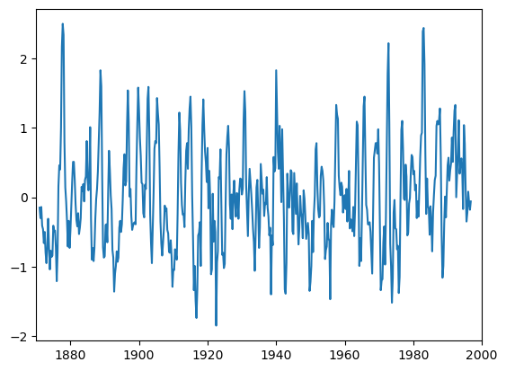 label='NINO3 SST'time = np.arange(0, N) * dt + t0plot the raw time-series